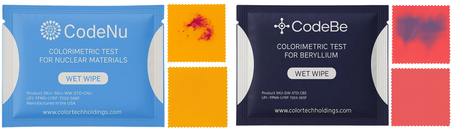 Simple, fast, accurate, on-site results (no lab required) with minimal or no training required. We offer capabilities to detect or confirm the presence of Beryllium, Uranium and Plutonium at trace levels. Our wet or dry wipes enable specificity; providing a distinct, near instantaneous color change when brought into contact with sources of contamination.